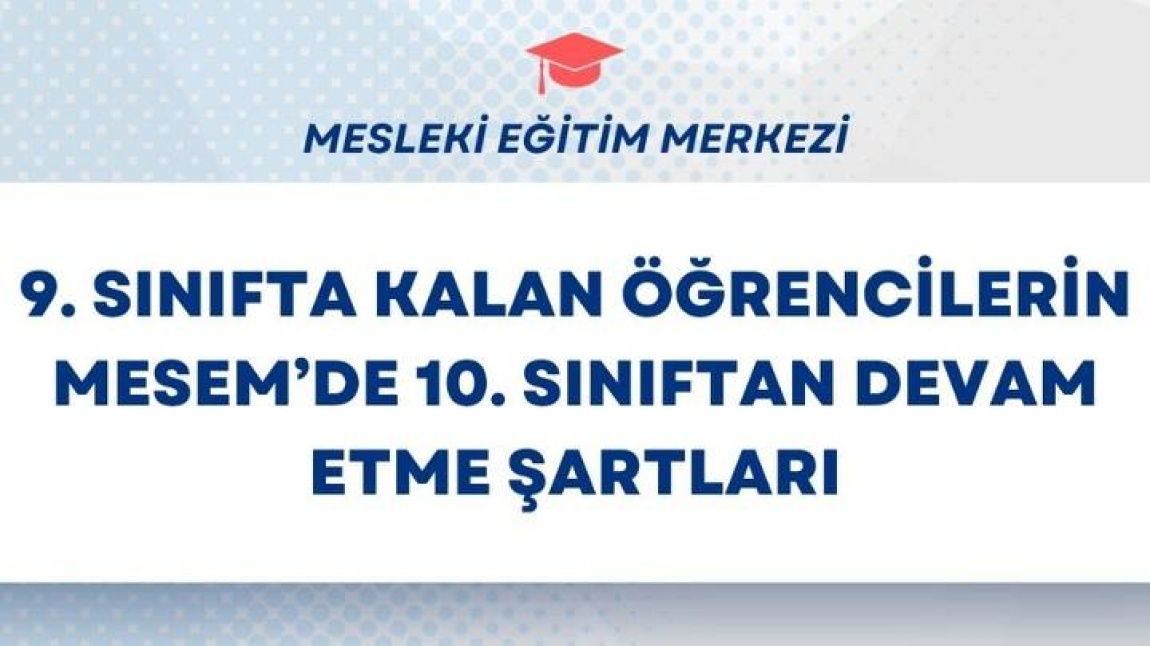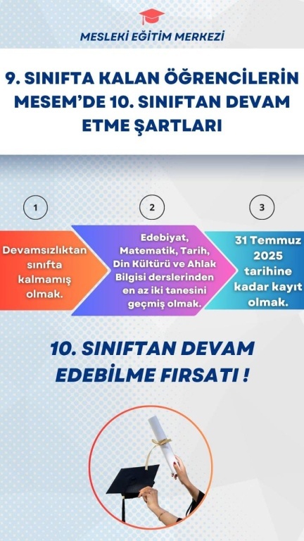 9.sınıfta başarı durumundan dolayı sınıf tekrarı durumuna düşen öğrencilerimiz için Türk Dili ve Edebiyatı, Matematik,Din Kültürü ve Ahlak Bilgisi ile Tarih derslerinin en az ikisinden başarılı olanların temmuz ayı sonuna kadar yıl kaybı olmadan MESEM(Mesleki Eğitim Merkezi)bünyesinde 10.sınıfa geçişleri yapılabilecektir.Bu durumda olan öğrencilerin 31/07/2025 tarihi mesai bitimine kadar en yakın mesleki eğitim merkezine müracaat etmesi gerekmektedir.